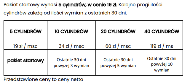 -> Ilość cylindrów na wynajem można zwiększać zgodnie z pakietami, np. z pakietu 5 cylindrów można przejść na pakiet 10 cylindrów, czyli dosyłamy jeszcze 5 pełnych cylindrów, a pakiet miesięczny zmienia się na 34zł netto według cennika. – zmiana pakietu jest zależna od ilości wymian z ostatnich 30 dni.