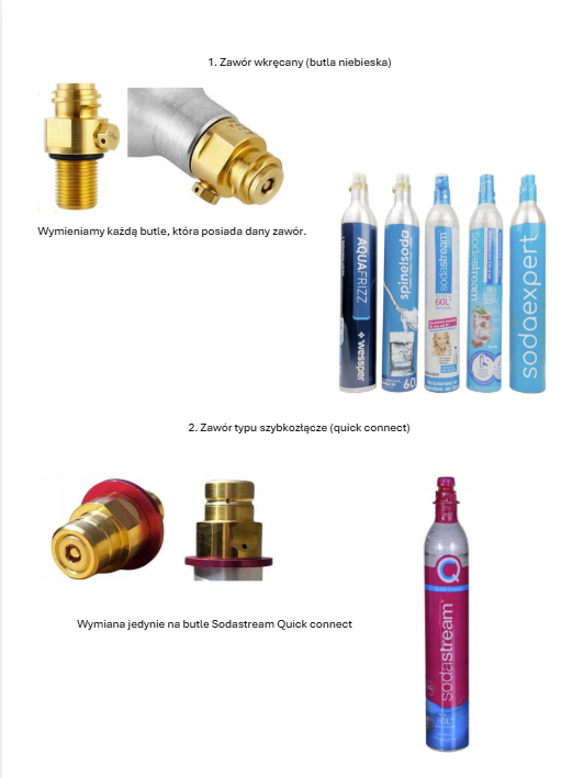 Butla niebieska ma zawór jednokierunkowy lub dwukierunkowy – inaczej zawór wkręcany. Stosuje się ją w saturatorach firm: Brita, Philips, Spinel, Dafi etc. Każda niebieska butla jest kompatybilna ze sobą i można ją wymieniać zamiennie.